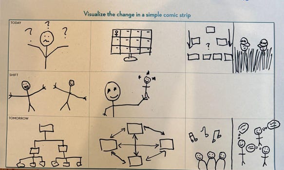 After teams complete the canvas, I ask them to translate it into a simple storyboard — a comic strip of the journey.