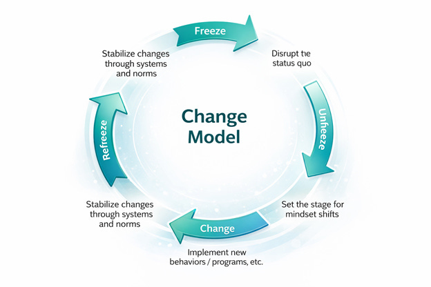 The structure is loosely inspired by Kurt Lewin’s early change model.